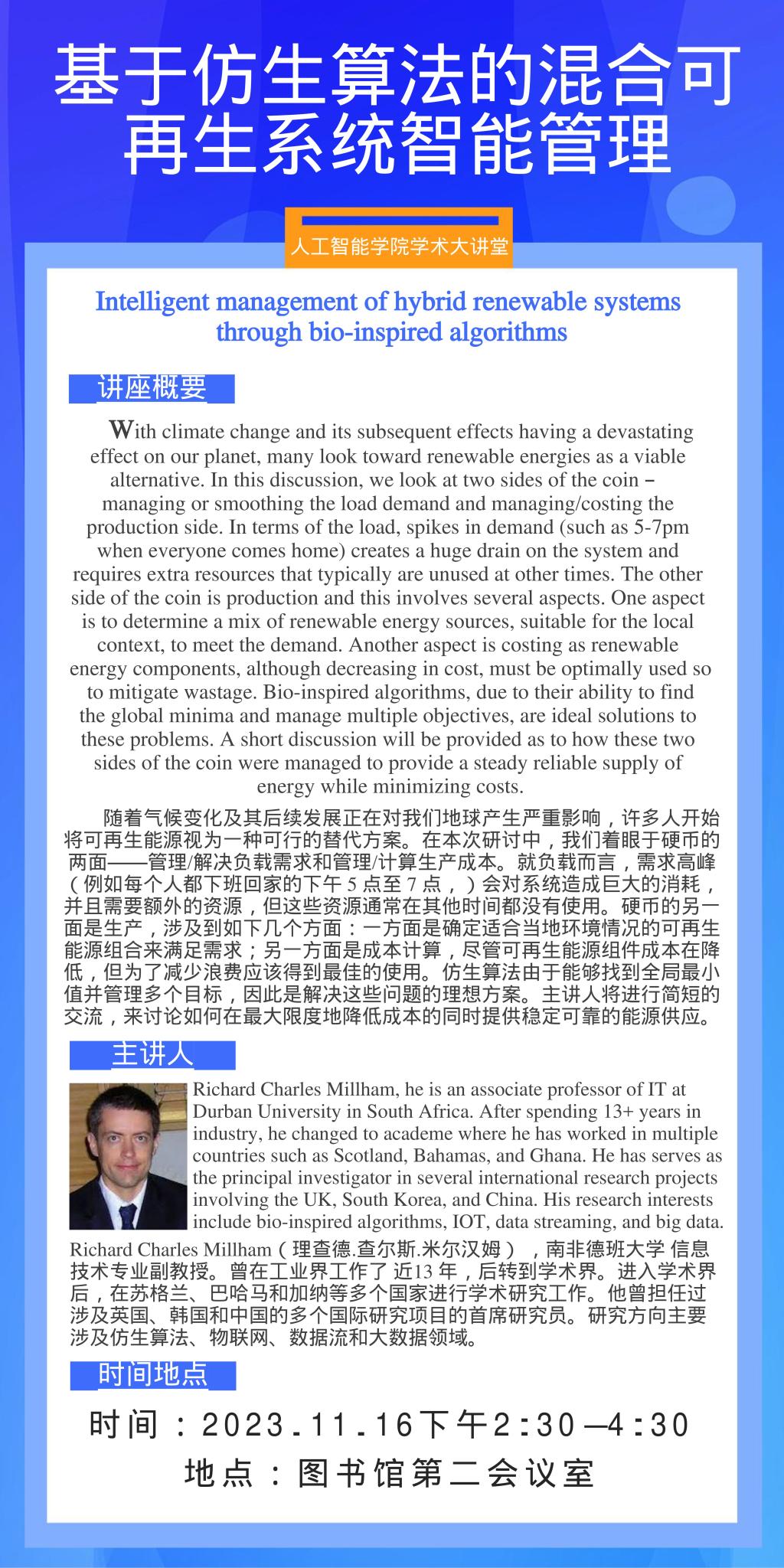 讲座通知《基于仿生算法的混合可再生系统智能管理》