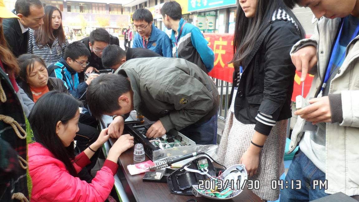 下午1:30各部门人员在香樟林集合,1:40各部门各派的部长或干事先到渝能国际向物管借桌子,2:00会长、部长和干事拿着维修工具到渝能国际。2:30宣传部开始拉“太阳成集团122ccvip家电维修协会”横幅并派人员到各个小区进行宣传义务维修活动。居民们纷纷拿着需要维修的物品下来修,如电饭锅、电磁炉、电风扇、电吹风、电脑、音箱和插线板等。会长、部长和干事们都动起手来修东西。在家协人的努力下,很多件待修物品都被我们修好了。旁边围观的居民越来越多都对我们表示赞同和感谢。有的人还问我们下次什么时候再去。5:30我们该去还桌子了,可那时拿东西来维修的人还没有断,我们把桌子还了之后又在旁边的椅子上继续为居民维修。6点,我们完美的结束我们的这次维修活动。家协人在回来的路上分享了维修经验。