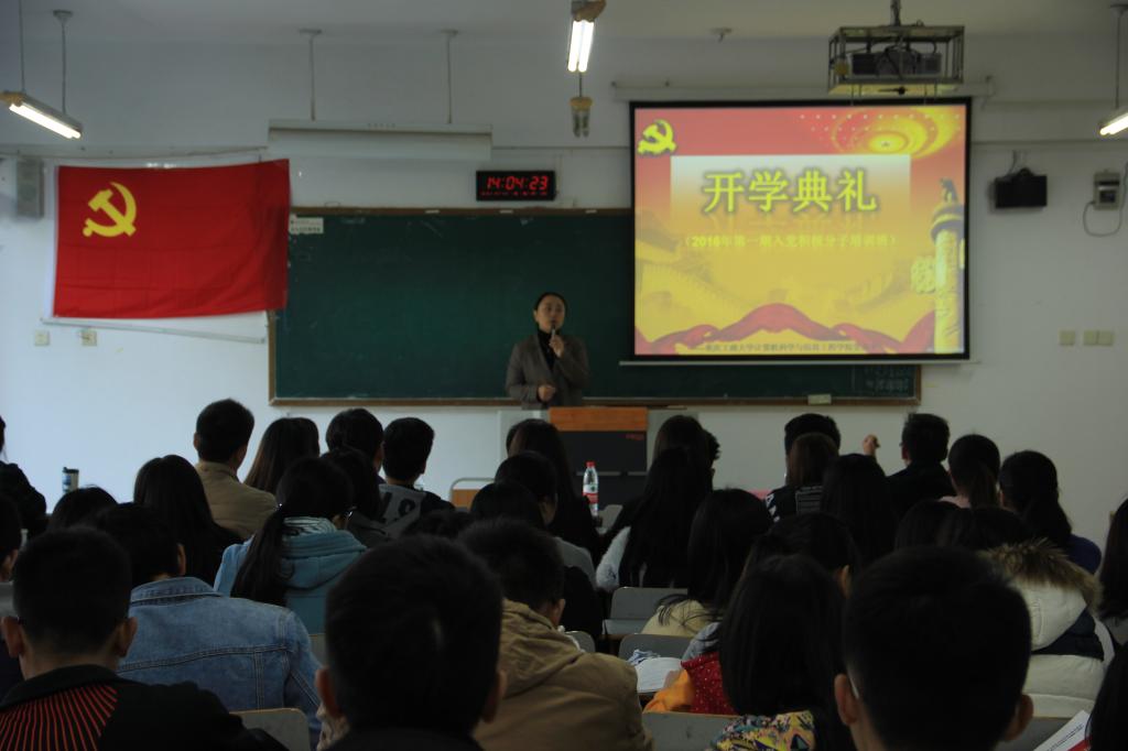 典礼由分团委书记刘昶老师主持。首先全体起立合唱《国际歌》,随后党总支陈亚惠副书记致辞,强调党课培训的重要性,要求同学们借此次党课培训机会,树立远大的理想,以自身的实际行动来践行党的宗旨,为靠近党组织而努力。随后公司代表15级自动化2班蒋涵玥同学上台发言,表明了向党靠拢的决心。之后,陈亚惠围绕“十八届六中全会”的主题,为同学们进行本次党课培训第一讲的授课,让我们认真学习十八届六中全会全面从严治党的精神。随后,徐秀慧老师与刘昶老师分别为同学们讲述了《中国共产党的指导思想》与《中国共产党的性质、宗旨、纲领和现阶段任务》。晚上19点整,黄亚果老师与李菁老师先后讲述了《中国共产党党员》与《中国共产党的组织原则和纪律》。详细又不乏生动的讲解,让同学们受益匪浅。