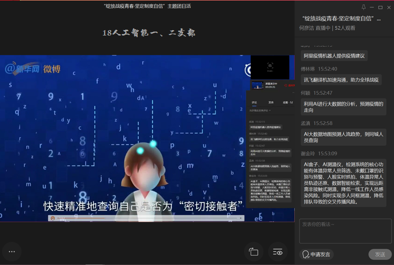 18物联网、18电子二等团支部通过观看新冠病毒防控科普视频、分享感恩故事以致敬抗疫英雄。活动中青年团员们积极讨论、交流学习体会,在疫情面前,更加深刻体会到党的正确领导和中国特色社会主义制度的先进性。团员们纷纷表达爱国热情和报国之志。