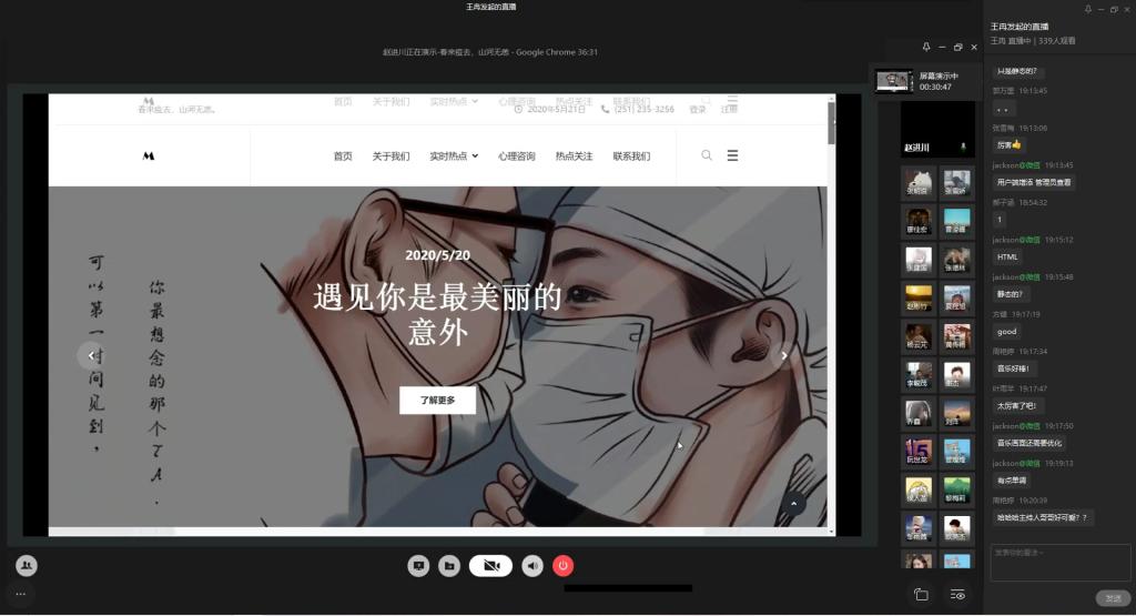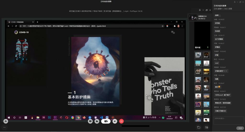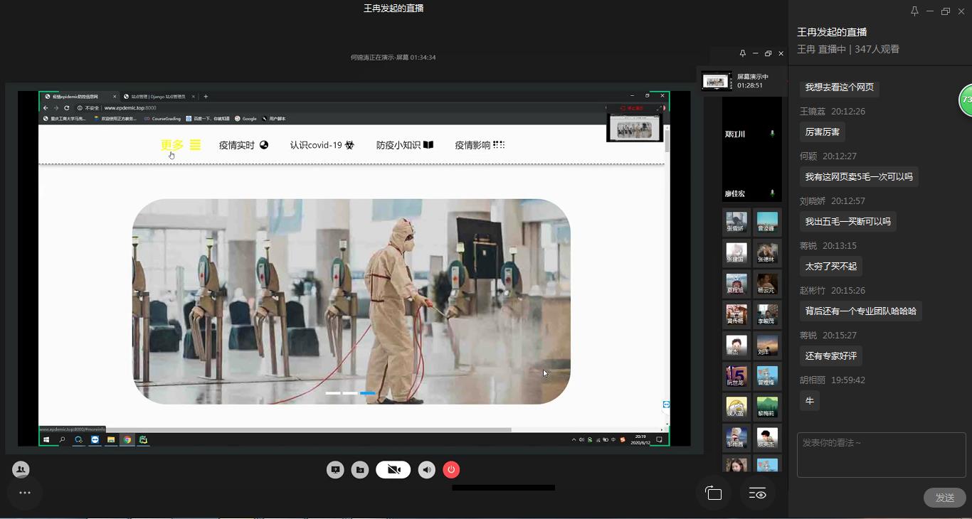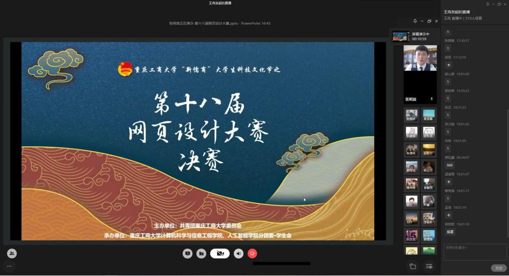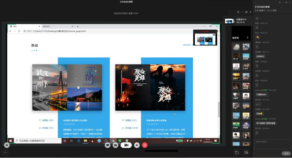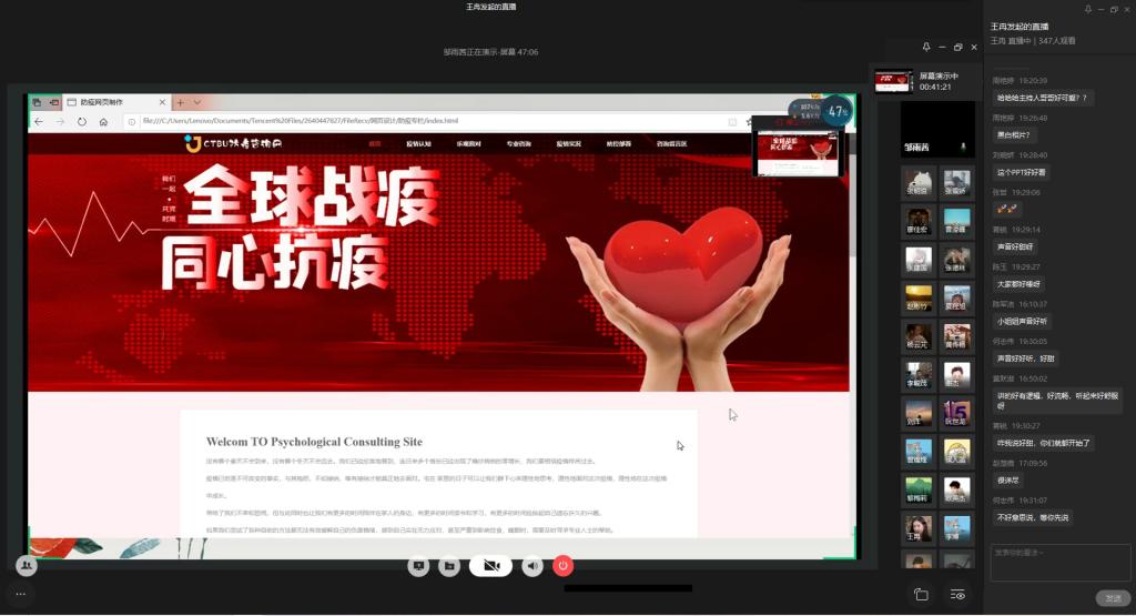 为弘扬伟大民族精神,厚植家国情怀,凝聚众志成城共抗疫情的强大力量,引导员工结合专业知识积极思考、实践,为抗疫贡献自己的智慧和力量,由校团委主办,太阳成集团122ccvip、太阳成集团122ccvip承办的“新儒商”老员工科技文化节之“共抗疫情,爱国力行”主题网页设计大赛决赛于6月12日晚上7点在企业微信直播间顺利举行。计信公司杨永斌副教授,杨艺副教授,唐灿副教授,赖涵博士应邀担任决赛评委。大赛邀请了校团委陆嘉副书记、计信公司分党委陈亚惠副书记、校团委徐阔老师,计信公司学工办副主任向巧老师观摩指导比赛。决赛受到了各公司员工广泛关注,吸引了超过800人次的观看。