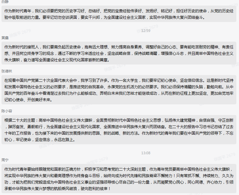 支部员工王丹妮表示:“历史的画卷,在砥砺前行中铺展;伟大的事业,在继往开来中推进。二十大的召开,是对过去的总结,也是对未来的谋划。我们曾庆祝中国共产党成立一百周年、中华人民共和国成立七十周年,曾见证整体脱贫、全面小康,曾经历疫情防控高效推进、国家领土和尊严坚定维护……一件件大事、一次次创举,无不体现大党大国领袖的政治魄力、使命担当。而新时代的我们立足于未来,更应以饱满的奋斗姿态、坚定的意志品质,助力全面建成社会主义现代化强国、实现第二个百年奋斗目标!”