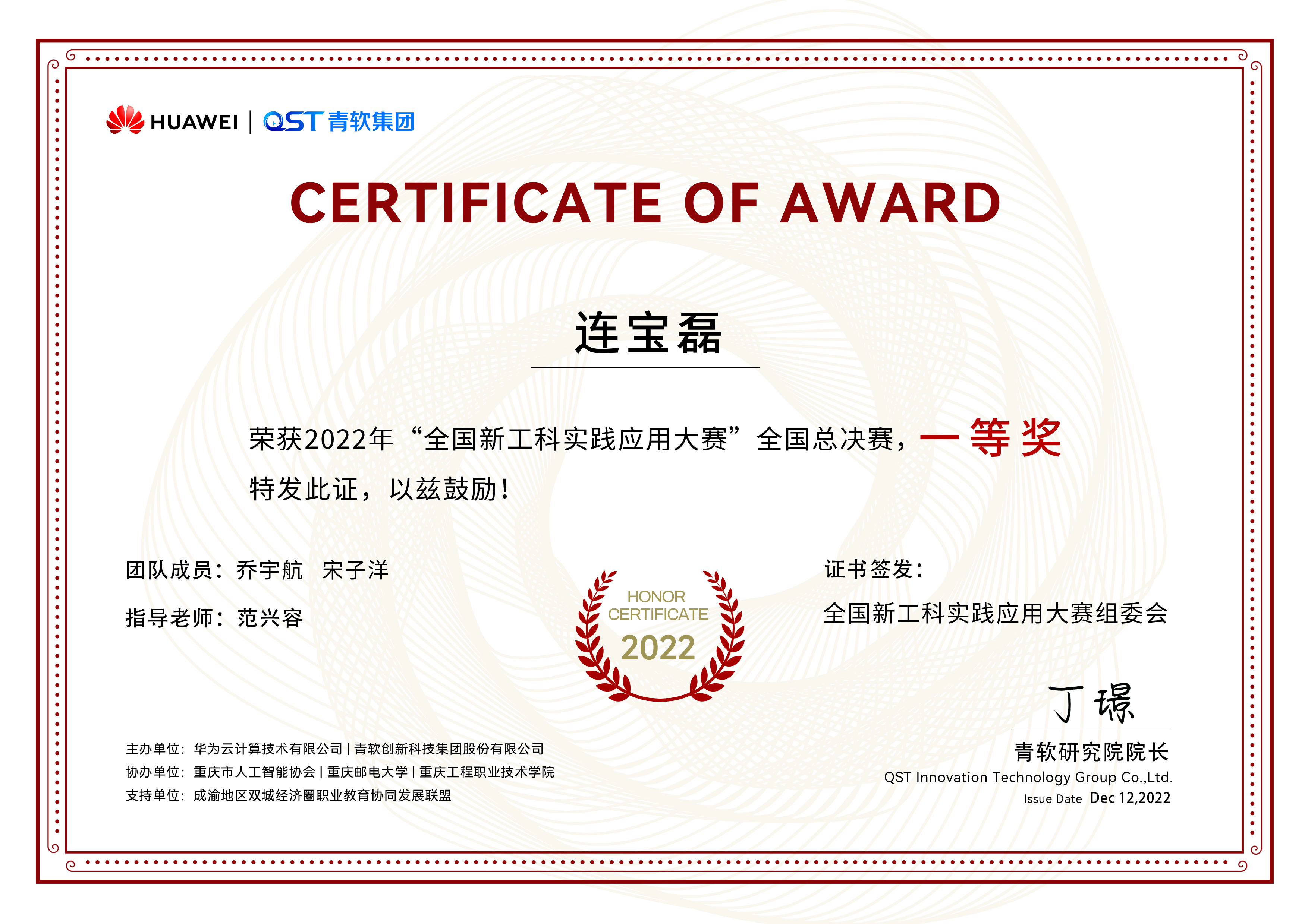 “2022年全国新工科实践应用大赛”是由重庆邮电大学、华为云计算技术有限公司和⻘软创 新科技集团股份有限公司联合举办,基于当下热⻔的人工智能领域,结合当前产业热点需求及 企业真实项目案例,通过“学、训、赛”的模式,帮助高校员工体验企业实际场景应用的开发、 提升软件编程技能、扩展知识体系、提高运用理论知识解决实际问题的能力。