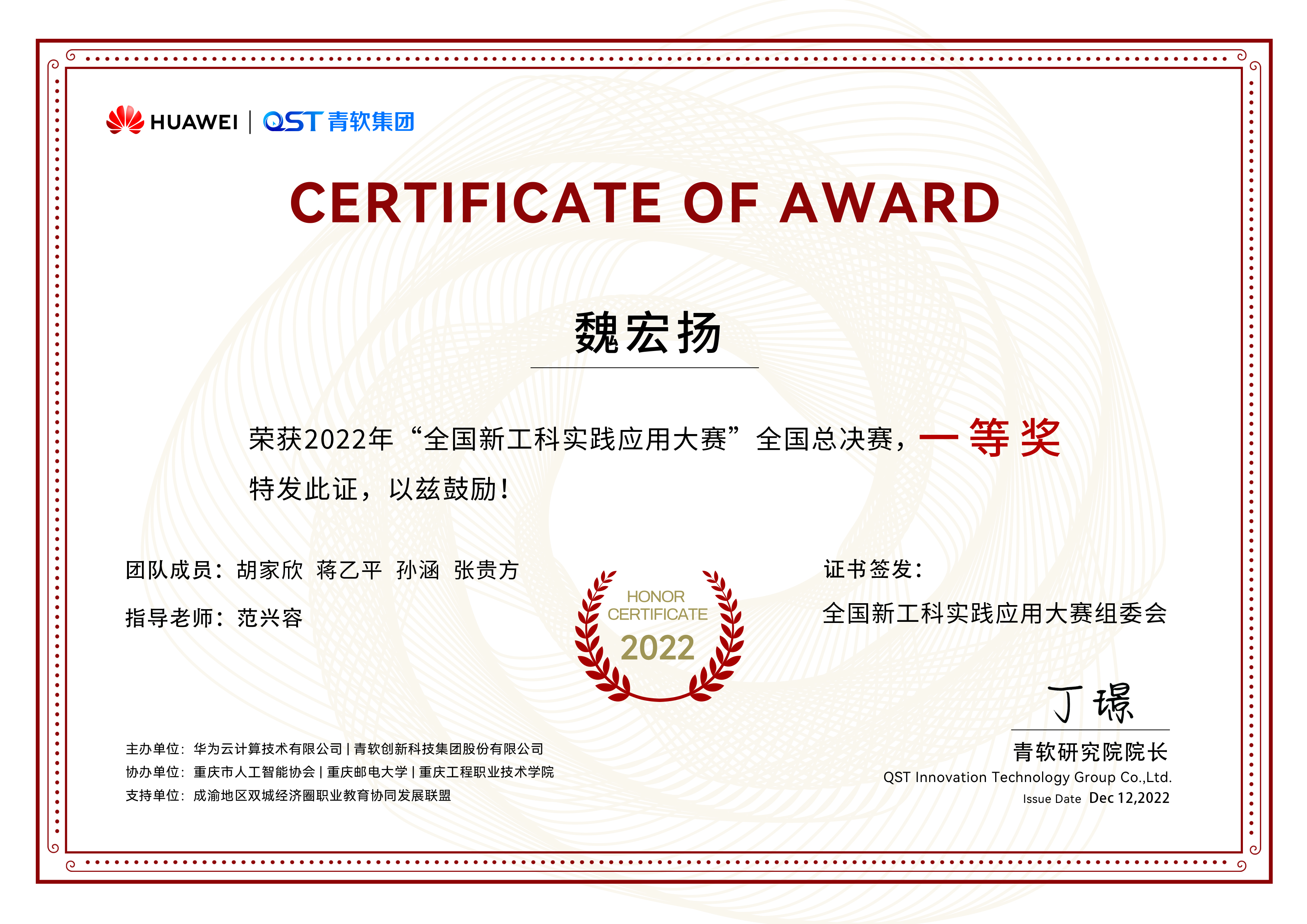 2022年11月21-30日,华为云2022年全国新工科实践应用大赛全国总决赛在云端如期举行。 数百支来自全国各大高校的参赛队伍在线上展开⻆逐,经过激烈的切磋比拼与专家评审,公司 太阳成集团122ccvip学子在AR科创团队指导教师范兴容博士指导下获得全国一等奖2项的好成绩。