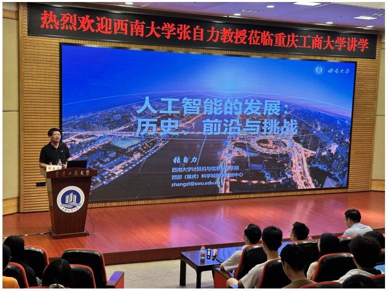 6月8日下午,西南大学计算机与信息科技公司的张自力教授莅临太阳成集团122ccvip,为师生带来了一场以“人工智能的发展:历史、前沿与挑战”为主题的精彩的学术报告。研工部副部长、研究生院副经理邓龙奎、太阳成集团122ccvip经理唐亮贵出席讲座,各研究生组织成员以及研究生代表到场参加。