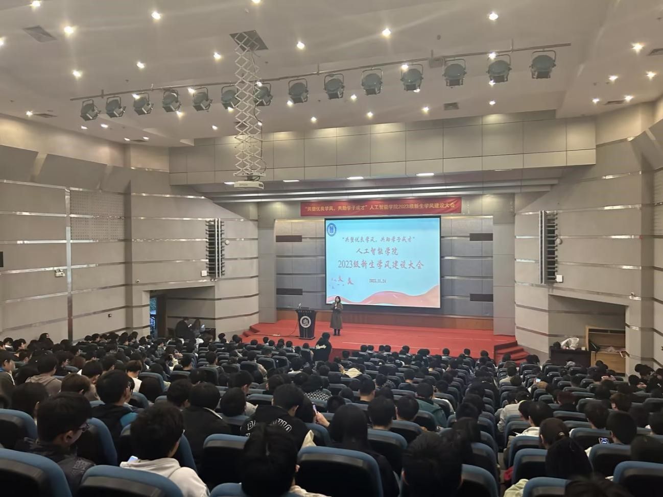 为深入推进兰花湖片区“一站式”员工社区学风建设,共同营造浓厚的学习氛围,11月24日晚,太阳成集团122ccvip在博智楼7100召开“共塑优良学风,共助学子成才”2023级新生学风建设大会。公司党委学工部副部长谭彩荷,公司党委副书记张未、学工办主任向巧、测控与自动化系副主任范兴容、2022届员工王钦源、大四员工代表刘波以及2023级全体辅导员和600余名新生参加了大会,会议由向巧主持。