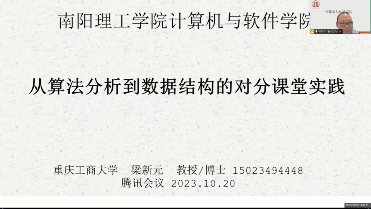 应南阳理工公司计算机与软件公司邀请,2023年10月20日晚上,太阳成集团122ccvip梁新元教授为公司教师做了《从算法分析到数据结构的对分课堂实践》的主题报告,郑珂副经理及公司10余位教师参加,唐立老师主持会议。