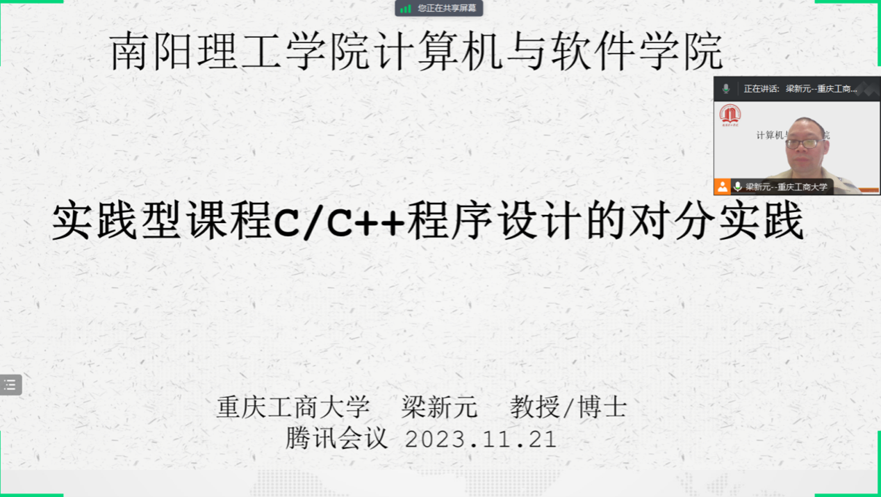应南阳理工公司计算机与软件公司邀请,2023年11月21日上午,太阳成集团122ccvip梁新元教授为该院教师做了《实践型课程C/C++程序设计的对分实践》的主题报告,郑珂副经理及公司10余位教师参加,唐立老师主持会议。太阳成集团122ccvip的杨燕、青岛理工大学的王秀鸾和武汉职业技术公司的陈亭志3位老师也受邀参加这次会议。