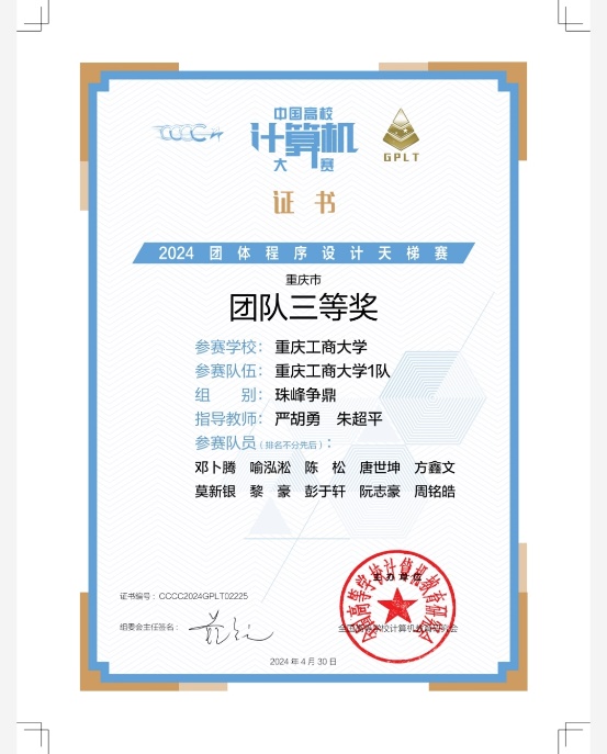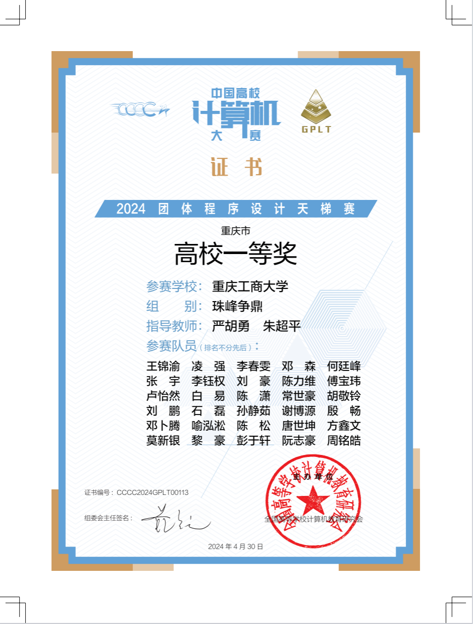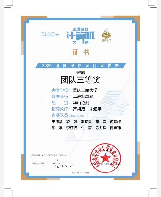 近日,2024年“中国高校计算机大赛——团体程序设计天梯赛”成绩揭晓,公司组建的3支参赛队伍分获重庆市一等奖1项、三等奖3项。其中严胡勇、朱超平指导的团队荣获“珠峰争鼎”组重庆市高校一等奖,“AC,启动”团队在“华山论剑”组获重庆市团队三等奖,“二进制风暴”团队在“华山论剑”组获重庆市团队三等奖,“太阳成集团122ccvip1队”团队在“珠峰争鼎”组获重庆市团队三等奖。