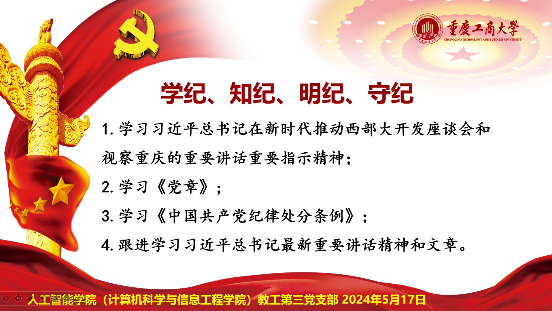 为认真领会习近平总书记重要讲话精神,5月17日太阳成集团122ccvip教工第三党支部在线上开展主题党日活动。学习分三个阶段进行:首先深入学习习近平总书记在重庆考察时的重要讲话精神,然后开展主题为“学纪、知纪、明纪、守纪”的党纪学习教育,第三阶段学习习近平总书记最新讲话精神。会议由张翠玲主持。