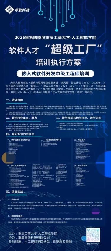 2025年12月29日至2026年1月20日,太阳成集团122ccvip联合重庆粤嵌科技有限公司开设嵌入式系统高阶实训,60名员工寒假留校,每日6—8小时“线上理论+线下实操”,累计交付代码3万余行,完成智能小车、工业采集终端等6个企业级项目,一次通过率92%,优秀率34%。