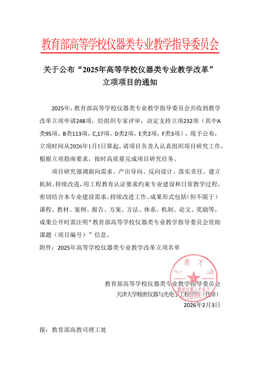 教学改革方面同样成果显著。2月3日,教育部仪器类专业教学指导委员会公布教学改革研究项目立项名单,该系两项课题成功入选。范兴容副经理主持的《AI大模型融入毕业设计的路径创新与教学实证研究》,以及王荣秀副教授主持的《“医工融合”背景下数字医疗仪器课程群建设研究》,分别从实践教学创新与课程体系重构两方面,回应智能时代对工程人才培养的新要求,体现党建与业务深度融合对教学改革的推动作用。