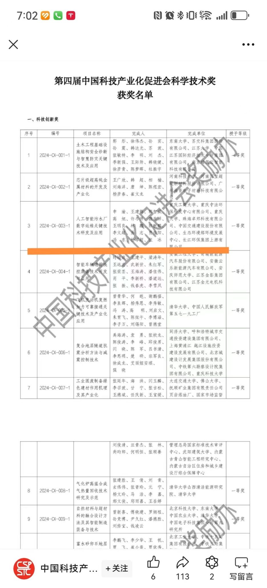 近日,第四届中国科技产业化促进会科学技术奖评选结果揭晓,由公司与国合基地联合研发的“人工智能污水厂数字运维关键技术研发及应用”项目荣获科技创新一等奖。