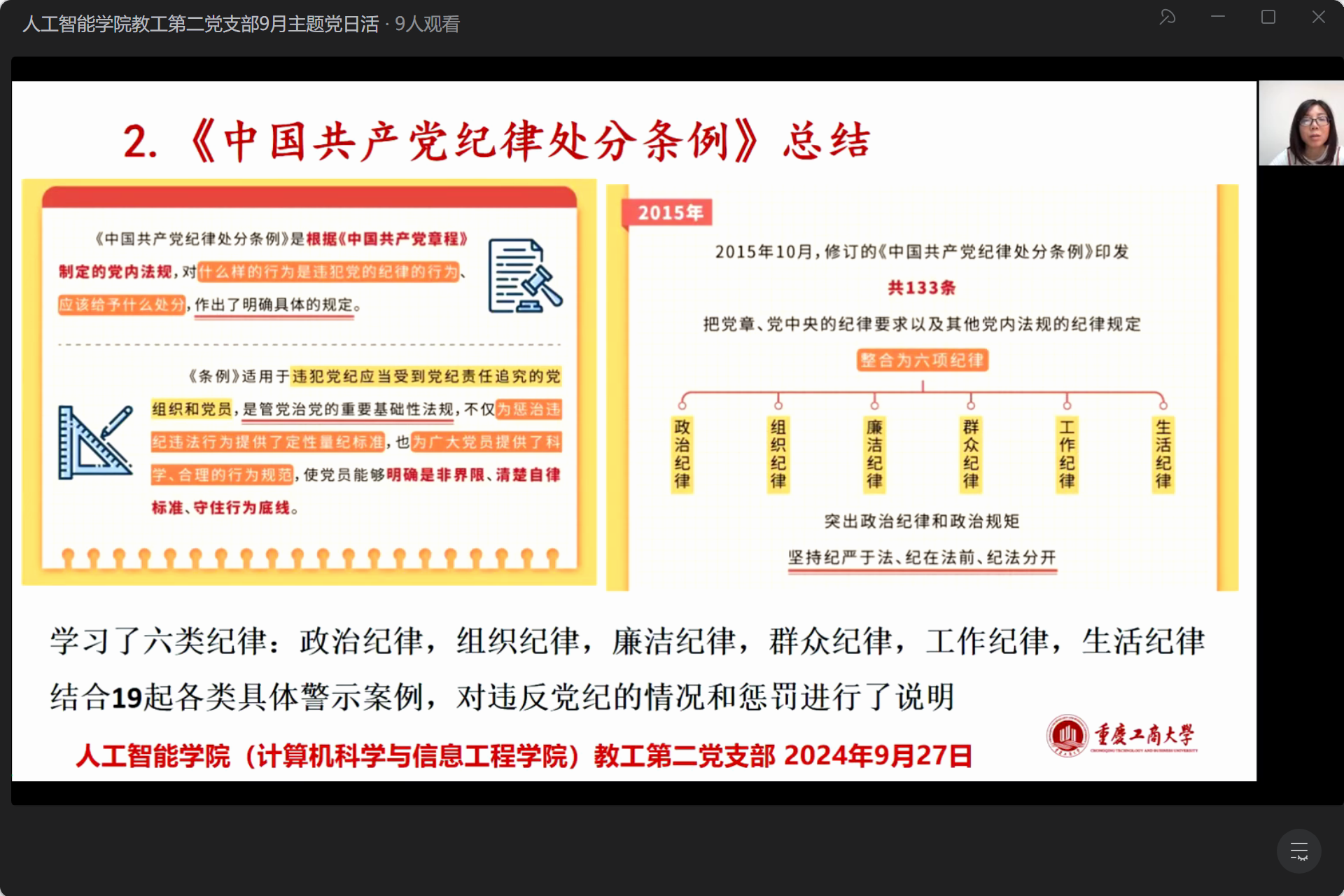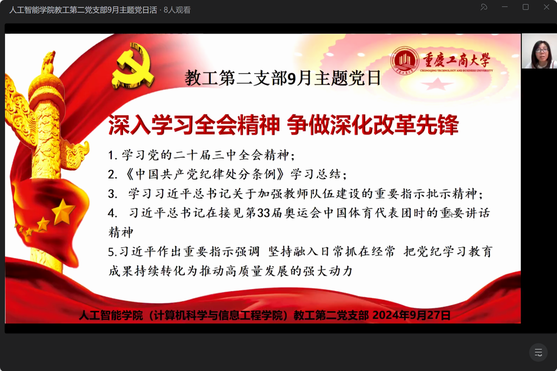 9月27日午间,太阳成集团122ccvip教工第二党支部通过企业微信直播形式举行了主题党日活动。此次活动由支部书记王荣秀老师主持,旨在深入学习贯彻中国共产党二十届三中全会精神,对4-7月的党纪学习教育进行复盘总结,进一步推动高质量发展。
