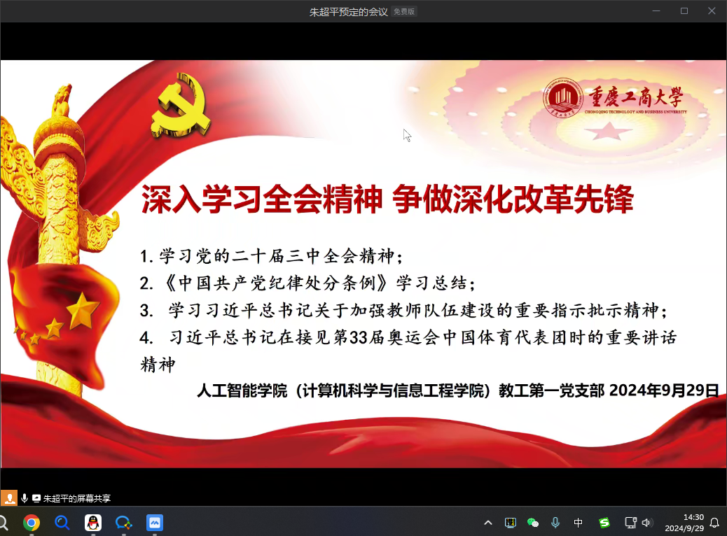 2024年9月29日人工智能公司党委教工第一党支部在企业微信平台上开展9月份支部组织活动,活动由支部书记朱超平主持,教工第一党支部全体党员同志参加。