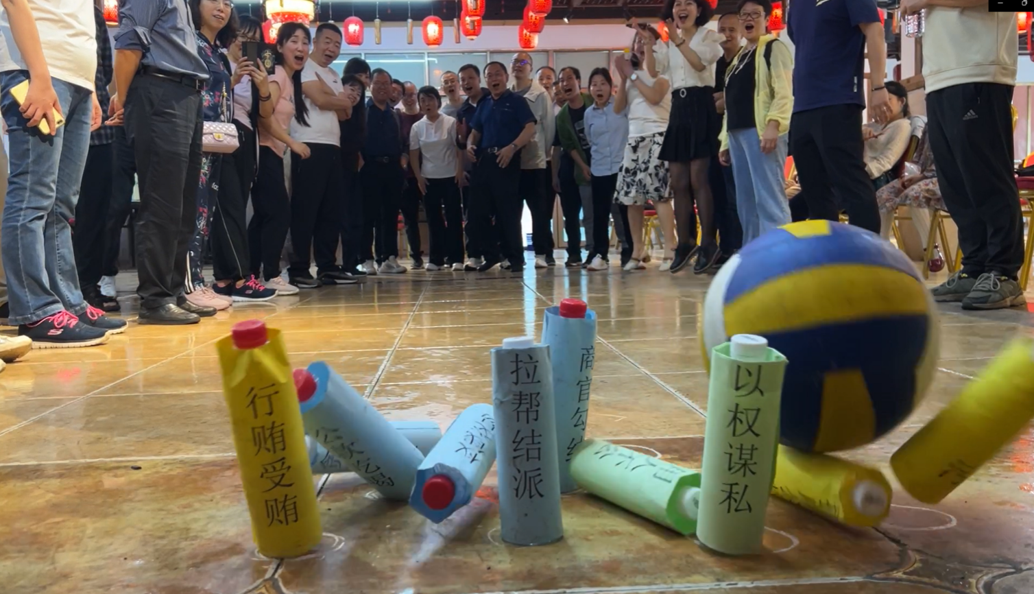 在“腐败之行大家击”环节,各组选手用力击倒代表腐败行为的10个瓶子,表明了对各种腐败行为的零容忍和坚决抵制。