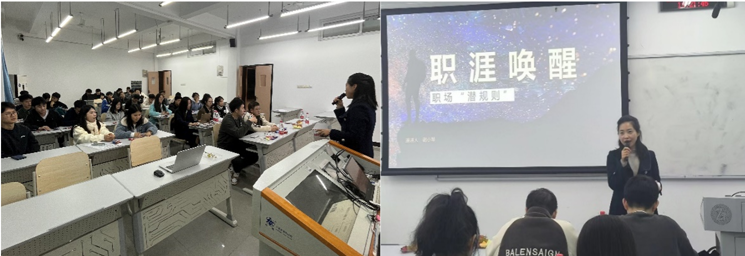 第二位主讲人,2023级研究生谢小琴,她具有丰富的软件开发和项目教学经验。曾在企业担任项目组长,负责Java项目开发及管理。她结合个人经历深入剖析了为人处事、工作饭局的要点,强调了高情商在职场中的重要性。她通过具体的情境抛砖引玉,引导同学们思考并解决人际交往中可能遇到的问题,为提升个人职场竞争力提出了中肯的建议。
