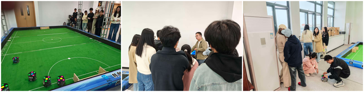 B401实验室配置的足球机器人平台具备完善功能,能够全面支持公司代表队备战中国机器人及人工智能大赛、睿抗机器人开发者大赛以及中国老员工工程实践与创新能力大赛等重要赛事。培训内容系统全面,涵盖七大模块:首先介绍了足球机器人的硬件结构,包括底盘、控球装置与射门机构等关键部件;随后讲解了机器人控制系统及电路板的基本功能;在软件应用方面,重点演示了操作管理系统的使用方法与策略脚本管理机制;此外,还涉及视觉识别系统的配置与调试方法,以及机器人的运动控制、角色分配与多机协同策略;培训还专门设置了比赛模式讲解与实战模拟环节,并针对常见故障排查与设备维护方法进行了指导。